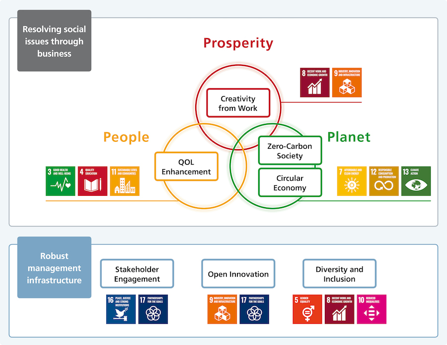 For the Ricoh Group, an ideal sustainable society is one in which the Three Ps Balance—a balance between Prosperity, People and Planet—is maintained. To create such a society, it has identified seven material issues in two areas, “Resolving social issues through business” and “Robust management infrastructure,” by reflecting Ricoh's Mission Statement, Mid-Term Management Plan (MTP), and expectations of its stakeholders. Furthermore, Ricoh has set 17 ESG goals linked to each materiality, and everyone, including management and employees, is working toward achieving those goals with a high degree of awareness.